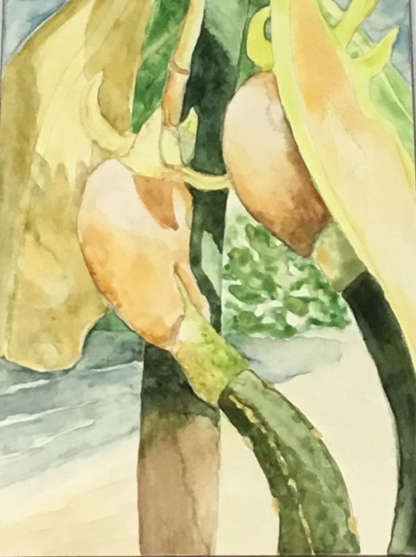"Peeking Through," 5x7" handmade watercolour paint on fresco-style aquabord, by MTGullberg, 2019. Contact me to order limited edition giclée prints on paper. Giclee prices vary with size.